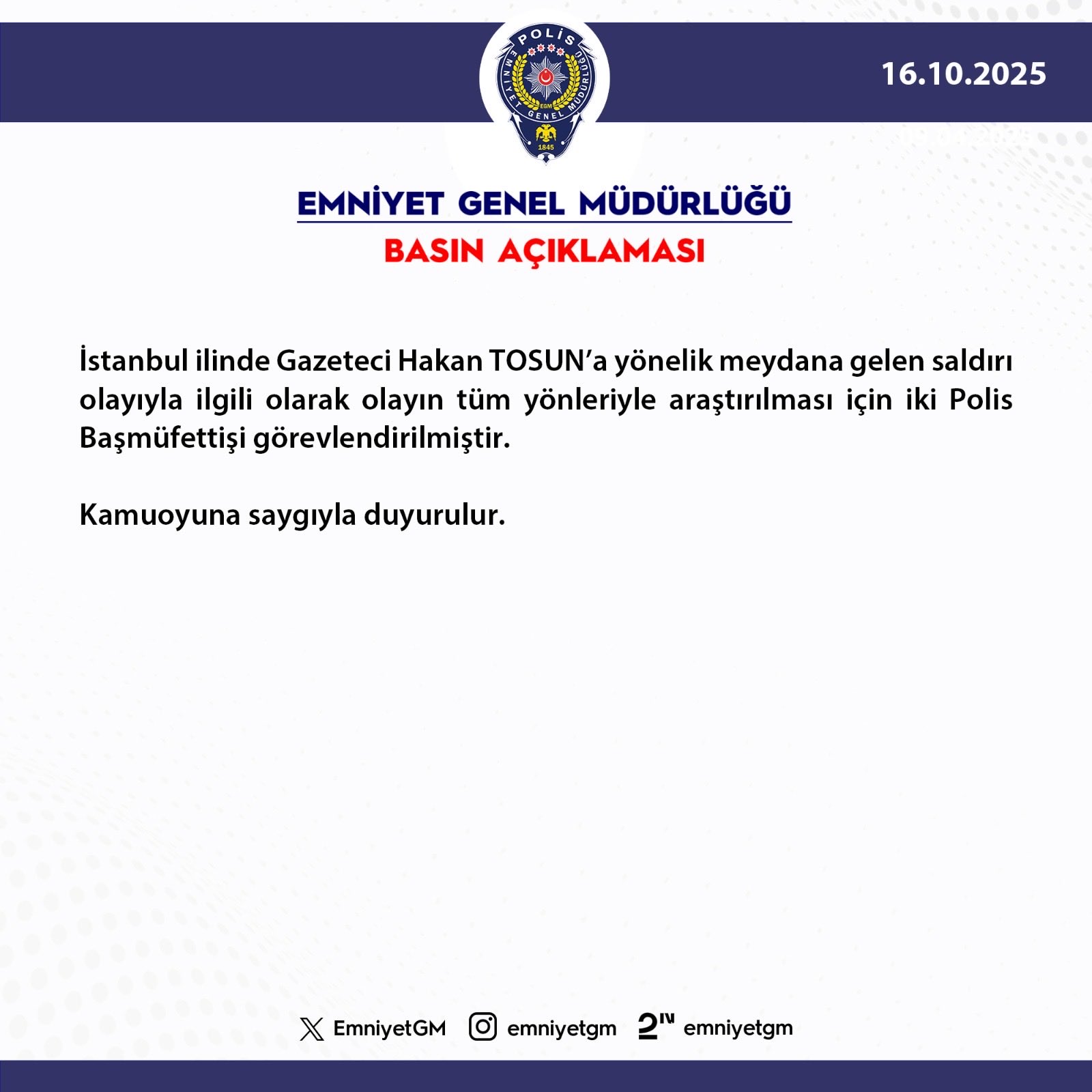 EGMden yapılan yazılı açıklamada, “İstanbul ilinde gazeteci Hakan Tosuna yönelik meydana gelen saldırı olayıyla ilgili olarak olayın tüm yönleriyle araştırılması için 2 Polis Başmüfettişi görevlendirilmiştir” denildi.