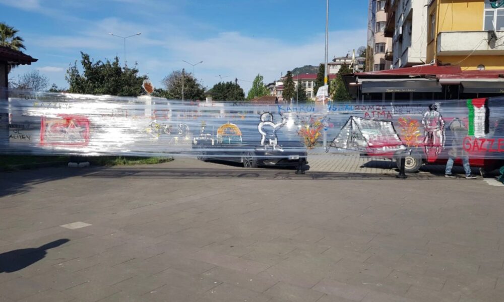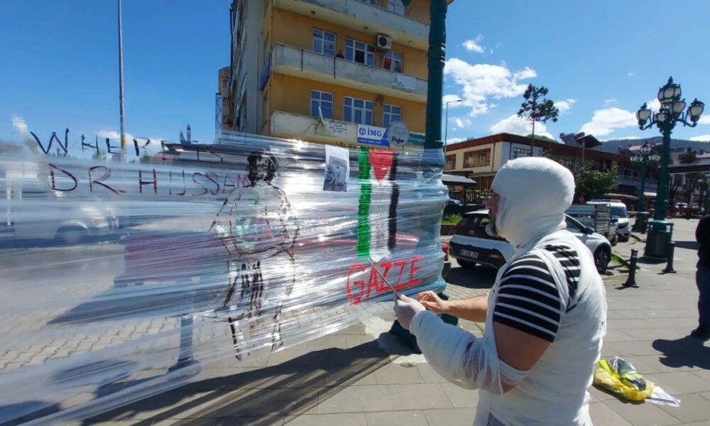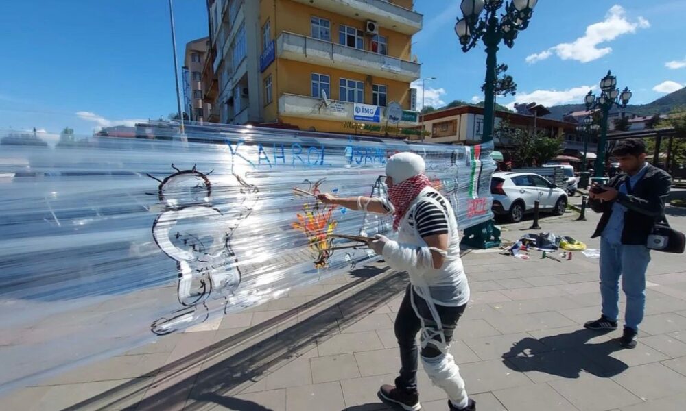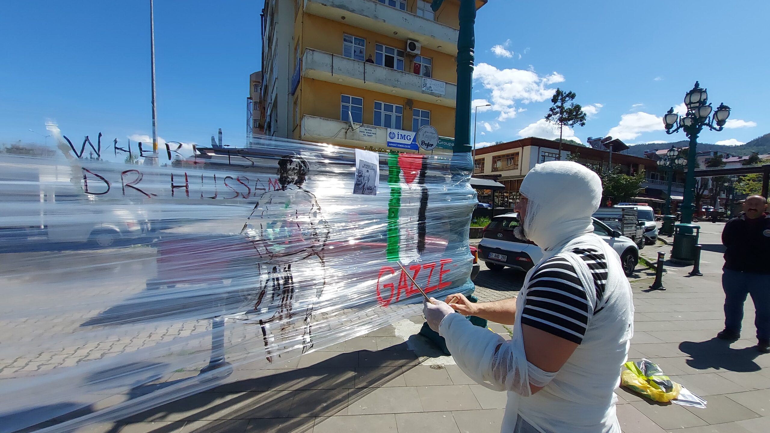 İsrail’in Gazze yönelik saldırılarına tepkiler sürüyor. Artvin Çoruh Üniversitesi Güzel Sanatlar ve Tasarım Fakültesi Görsel İletişim Tasarımı Bölüm Başkanı Doç. Dr. Kemal Sağlam da Gazze’de yaşananlara dikkat çekmek adına, ilçedeki merkez cami avlusunda 2 aydınlatma direği arasına streç film gerip tuval oluşturdu. Tuvale Gazze’de yaşananları resmeden Sağlam, resimlerinde sivillerin ve çadırların bombalandığı mesajlarını verdi. Tuvaline Filistin bayrağı ve Mescid-i Aksayı da çizen Doç. Dr. Sağlam, sargı bezleriyle sarılı kostüm giyip yaralı bir Filistinliyi de canlandırdı. Doç. Dr. Sağlama fakülte öğrencileri de eşlik etti. Gazze’de yaşanan insanlık dramına dikkat çekmek istediğini dile getiren Doç. Dr. Sağlam, “Son günlerde İsrail, 2 yıldır yaptığı katliamları daha büyüterek oradaki insanların bezden yapmış oldukları çadırları bile bombalamakta. Oradaki insanlar evlerini kaybetmiş durumdalar. Çadırlarda yaşam mücadelesi verirken, çoluk çocuk, bebek demeden tüm dünyanın gözü önünde insanlar öldürülüyor. Biz de bu yaşanan acı olayları bir sanatçının diliyle ifade etmek ve Gazze’deki katliamları anlatmaya çalıştık” diye konuştu.