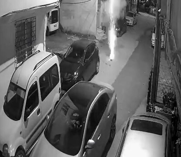 Olay, dün saat 23.30 sıralarında Osmangazi ilçesi Emek Mahallesi’nde meydana geldi. 41 AGM 303 plakalı otomobille bir sokağa giren 4 kişi, iki bina arasındaki boş arsanın önüne koydukları havai fişeği ateşleyip kaçtı. O anlar güvenlik kameralarına yansıdı.