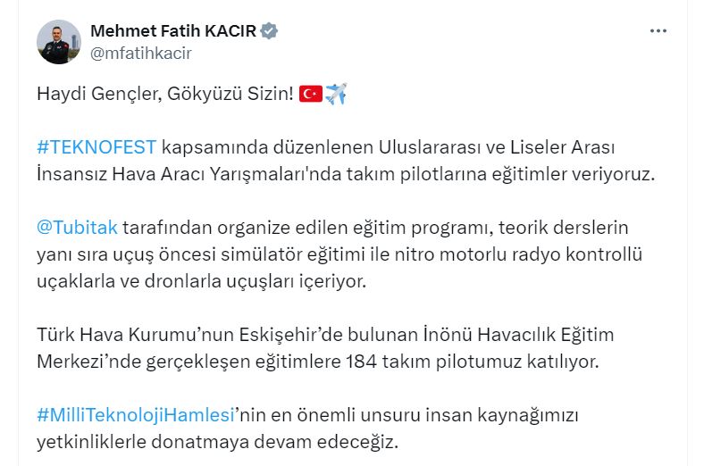 Bakan Kacır, sosyal medya hesabından yaptığı açıklamada, “TEKNOFEST kapsamında düzenlenen uluslararası ve liseler arası İnsansız Hava Aracı yarışmalarında takım pilotlarına eğitimler veriyoruz. TÜBİTAK tarafından organize edilen eğitim programı, teorik derslerin yanı sıra uçuş öncesi simülatör eğitimi ile nitro motorlu radyo kontrollü uçaklarla ve dronlarla uçuşları içeriyor. Türk Hava Kurumu’nun Eskişehirde bulunan İnönü Havacılık Eğitim Merkezinde gerçekleşen eğitimlere 184 takım pilotumuz katılıyor. Milli Teknoloji Hamlesinin en önemli unsuru insan kaynağımızı yetkinliklerle donatmaya devam edeceğiz” dedi.