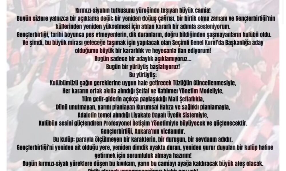 “Kırmızı-siyahın tutkusunu yüreğinde taşıyan büyük camia! Bugün sizlere yalnızca bir açıklama değil; bir yeniden doğuş çağrısı, bir birlik olma zamanı ve Gençlerbirliğinin küllerinden yeniden yükselmesi için atılan kararlı bir adımla sesleniyorum. Gençlerbirliği, tarihi boyunca pes etmeyenlerin, dik duranların, doğru bildiğinden şaşmayanların kulübü oldu. Ve şimdi, bu büyük mirası geleceğe taşımak için yapılacak olan Seçimli Genel Kurulda Başkanlığa aday olduğumu büyük bir kararlılık ve heyecanla ilan ediyorum! Bugün sadece bir adaylık açıklamıyoruz. Bugün bir yürüyüş başlatıyoruz! Bu yürüyüş; Kulübümüzü çağın gereklerine uygun hale getirecek Tüzüğün Güncellenmesiyle, Her kararın ortak akılla alındığı Şeffaf ve Katılımcı Yönetim Modeliyle, Tüm gelir-giderin açıkça paylaşıldığı Mali Şeffaflıkla, Dünü unutmayan, yarını planlayan Kurumsal Hafıza ve sağlıklı planlamayla, Adaletin temel alındığı Liyakate Dayalı Üyelik Sistemiyle, Kulübün sesini güçlendiren Profesyonel İletişim Yönetimiyle büyüyecek ve güçlenecektir.’ Gençlerbirliği, Ankaranın vicdanıdır. Bu kulüp: parayla ölçülmeyen bir karakterin, bir duruşun, bir sevdanın adıdır. Gençlerbirliğini yeniden ait olduğu yere, yeniden dimdik ayakta duran, yeniden gurur duyulan bir kulüp haline getirmek için sorumluluk almaya hazırım! Bugün kırmızı-siyah yüreklere düşen bu kıvılcım, yarın bu camiayı ayağa kaldıracak büyük ateş olacak. Birlik olursak yapamayacağımız hiçbir şey yok! Haydi Gençlerbirliği ailesi, Güçlenme zamanı! Ayağa kalkma zamanı! Birlikte yeniden doğma zamanı! Saygı, sevgi ve büyük bir heyecanla… Çağrı ÇetinGençlerbirliği Başkan Adayı”