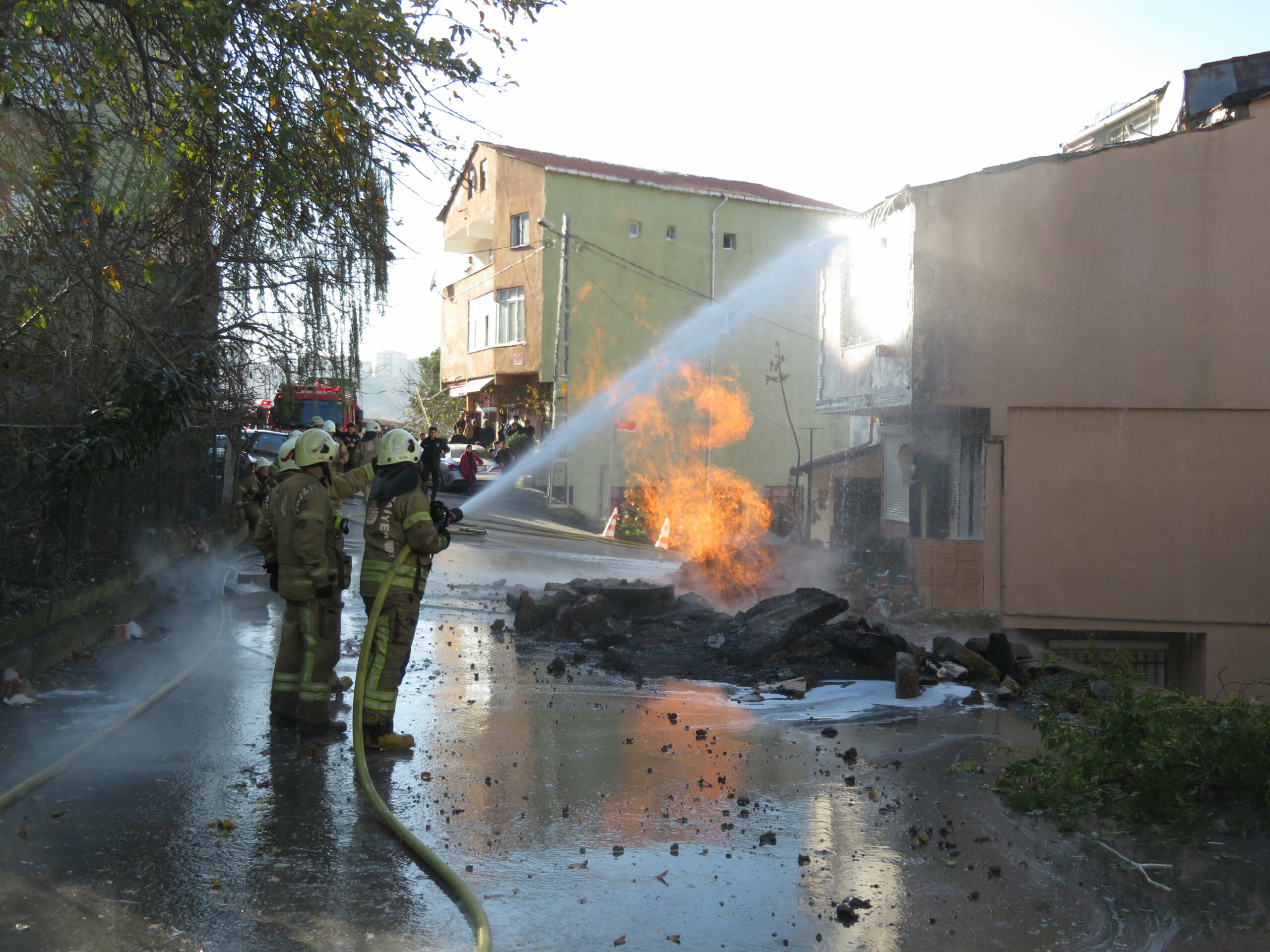 ÜSKÜDAR’da belediye ekiplerinin yol çalışması sırasında iş makinası doğalgaz borusunu patlattı. Patlama sonrası yangın çıktı. Alevler yakındaki bir binaya zarar verdi.
