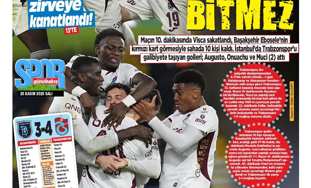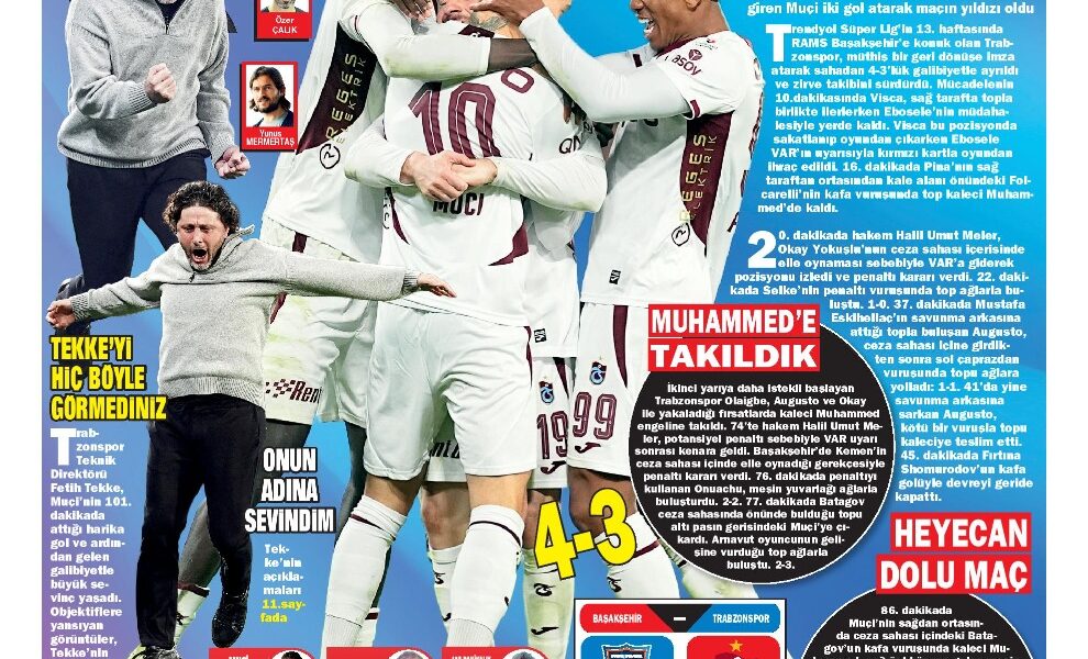 Süper Lig’in 13’üncü haftasında deplasmanda RAMS Başakşehir’i 4-3 mağlup eden Trabzonspor, puanını 28’e yükselterek zirve takibini sürdürdü. Bordo-mavililer, 10 kişi kalan rakibi karşısında iki kez geriye düştüğü mücadeleyi 90+11’inci dakikada bulduğu golle kazanarak haftanın en dikkat çekici galibiyetlerinden birine imza attı.