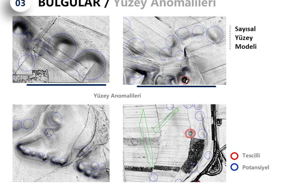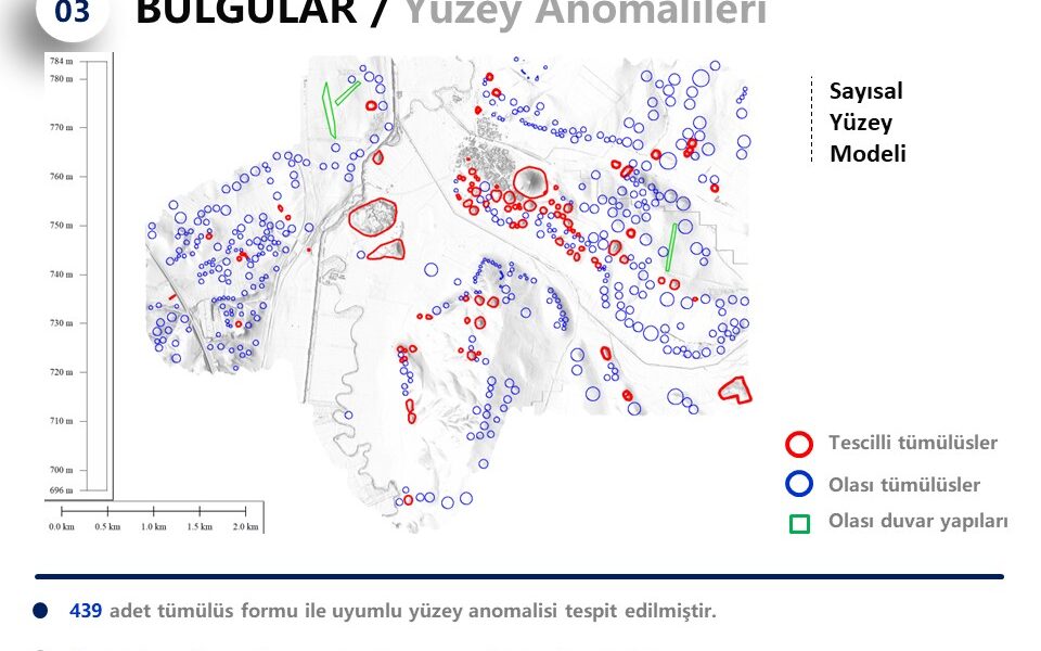Dr. Doğruluk, insansız hava araçlarıyla fotogrametrik görüntü alımı gerçekleştirip, 2 bin 200 hektarlık alan için sayısal yüzey modeli ürettiğini belirterek, “Bu model üzerinden de 3 farklı çalışma yürüttük. Öncelikle 3 boyutlu belgeleme yani tümülüslerin belgelenmesini içeren bir çalışma yaptık. Ve son 5 yıldaki yani 2019-2024 yılları arasındaki morfolojik değişimleri izledik. Son olarak da bir sanal tur oluşturduk. Bizim çalıştığımız alanda zaten 86 tane tümülüs tescilliydi. Biz bunları biliyorduk ve yaptığımız mekansal analizlerle işte eğim değişimleri, yükseklik değişimleri ve eğrilik değişimlerine bakarak burada 439 tane potansiyel tümülüs belirledik. 3 tane de duvar yapısı ile uyumlu anomali belirledik. Bunların da belgelemesini yaptık” dedi.
