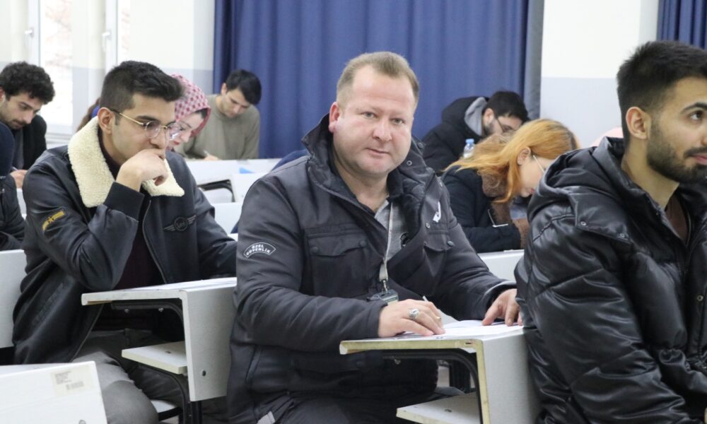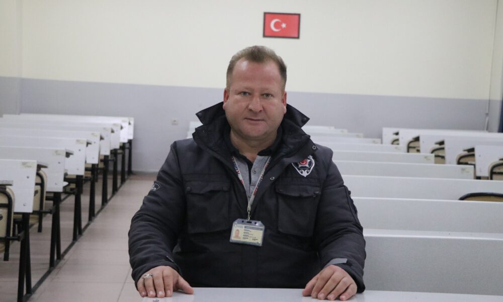 • Kayseri'de Erciyes Üniversitesi (ERÜ) durağında güvenlik personeli Bekir Akgüneş (34), (Fotoğrafta) kampüsteki öğrencilerden etkilenince hayali olan gazetecilik bölümünü okumaya başladı. Fotoğraf: Samed Aydın SUN/Kayseri, (DHA)