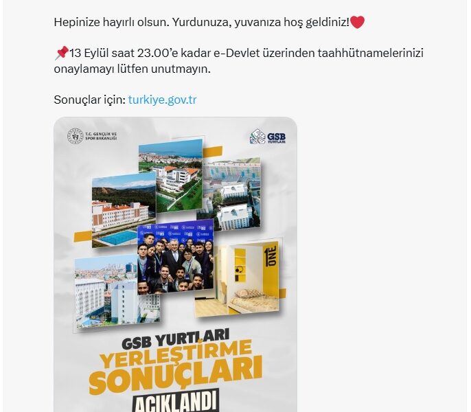 Gençlik ve Spor Bakanı Osman Aşkın Bak, sosyal medyadan yaptığı açıklamada, “Sevgili gençler, GSB yurtları yerleştirme sonuçları açıklandı. Hepinize hayırlı olsun. Yurdunuza, yuvanıza hoş geldiniz. 13 Eylül saat 23.00e kadar e-Devlet üzerinden taahhütnamelerinizi onaylamayı lütfen unutmayın” ifadelerini kullandı.