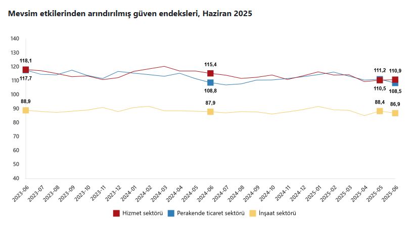 TÜİK, Haziran 2025 dönemine ilişkin hizmet, perakende ticaret ve inşaat güven endekslerini açıkladı. Buna göre; güven endeksi haziran ayında bir önceki aya göre; hizmet sektöründe yüzde 0,4 oranında artarak 110,9 değerini, perakende ticaret sektöründe yüzde 2,5 oranında azalarak 108,5 değerini ve inşaat sektöründe yüzde 1,7 oranında azalarak 86,9 değerini aldı.