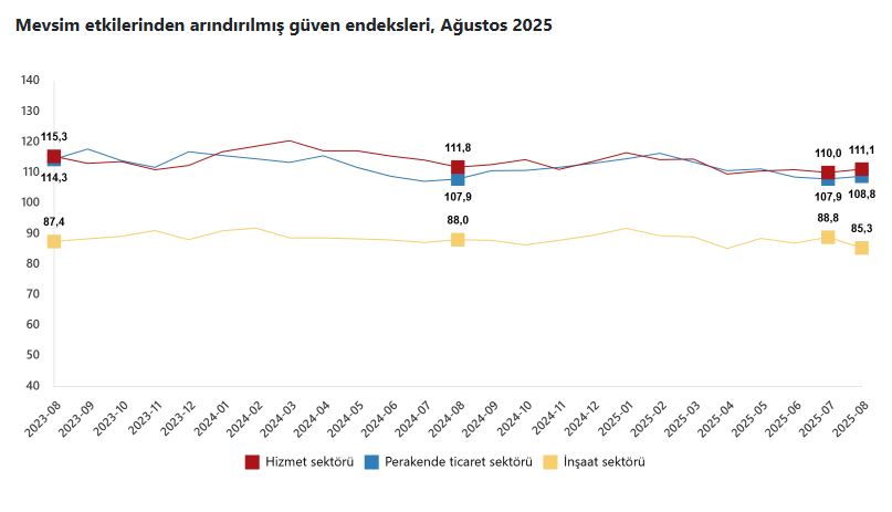 TÜİK, Ağustos 2025 dönemine ilişkin hizmet, perakende ticaret ve inşaat güven endekslerini açıkladı. Buna göre; güven endeksi ağustos ayında bir önceki aya göre hizmet sektöründe yüzde 1,1 oranında artarak 111,1 değerini, perakende ticaret sektöründe yüzde 0,8 oranında artarak 108,8 değerini ve inşaat sektöründe yüzde 4 oranında azalarak 85,3 değerini aldı.