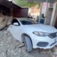 Hafriyat boşaltan kamyon, park halindeki otomobilin üstüne devrildi