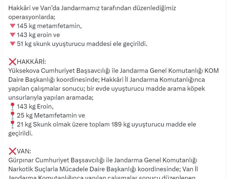Bakan Ali Yerlikayanın sosyal medya hesabından yaptığı açıklamaya göre, Hakkaride Yüksekova Cumhuriyet Başsavcılığı ile Jandarma Genel Komutanlığı Kaçakçılık ve Organize Suçlarla Mücadele Daire Başkanlığı koordinesinde; Hakkari İl Jandarma Komutanlığı tarafından çalışma başlatıldı. Bu kapsamda, uyuşturucu arama köpeğiyle bir evde yapılan aramada; 143 kilo eroin, 25 kilo metamfetamin ve 21 kilo skunk olmak üzere toplam 189 kilo uyuşturucu ele geçirildi.