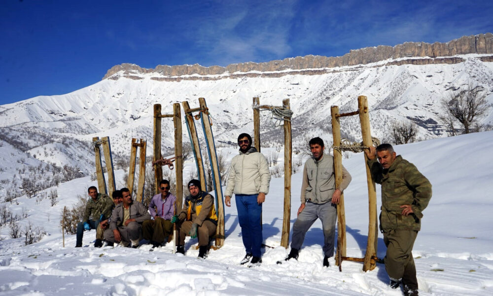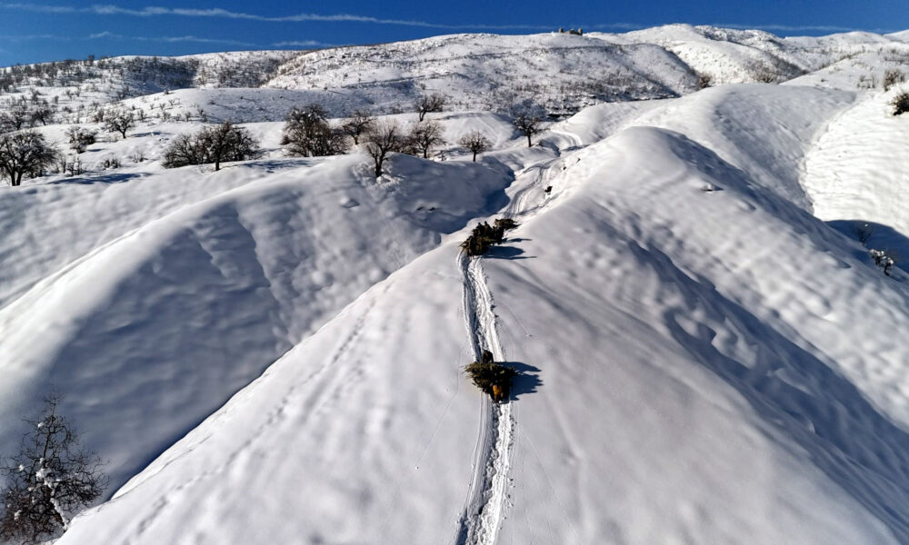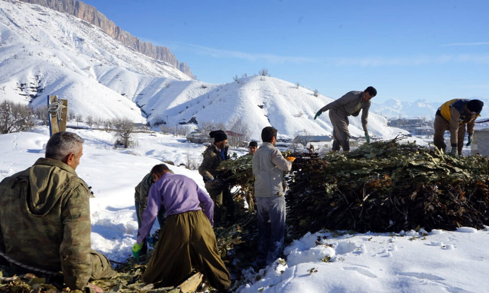 Irak sınırında bulunan Derecik ilçesine bağlı Umurlu köyünde yaşayan besiciler, kış mevsiminde büyük sıkıntı yaşıyor. Yazın traktörlerin giremediği dağlık alanlarda biçilen otlar, istiflenerek kışa hazırlanıyor. Kar yağışının ardından omuzlarına aldıkları kızaklarla dağlara çıkan besiciler, yaklaşık 1,5 saatlik yürüyüşün ardından otlara ulaşıyor. Topladıkları ot ve yaprakları kızaklara yükleyen besiciler, uzun ve zahmetli bir yolculuk sonrası köye dönüyor. Köylüler, bu zorlu yolculuğu ise havadan dron ile görüntülendi.