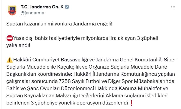 Jandarma Genel Komutanlığının sosyal medya hesabından yapılan açıklamaya göre; Hakkari Cumhuriyet Başsavcılığı ve Jandarma Genel Komutanlığı koordinesinde, Yasa dışı bahis ve Suç gelirini aklama suçlarına yönelik operasyon düzenlendi. Şüphelilerin farklı hesaplar üzerinden toplamda 50 milyon TL işlem hacmine ulaştığı, yasa dışı bahis oynatarak elde ettikleri gelirleri banka ve kripto cüzdanlar aracılığıyla akladıkları tespit edildi. Operasyonda 3 şüpheli gözaltına alınırken, 44 masaüstü bilgisayar, çok sayıda cep telefonu, bellek, muhtelif doküman ve dijital materyal ele geçirildi. Suçtan elde edilen 50 milyon TL işlem hacmine sahip banka hesapları ve kripto varlık cüzdanlarına el konuldu.