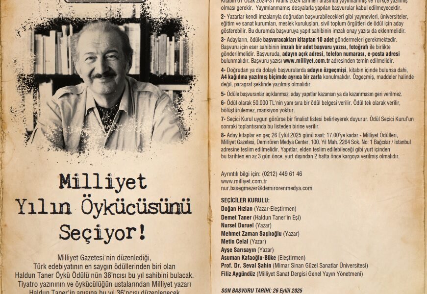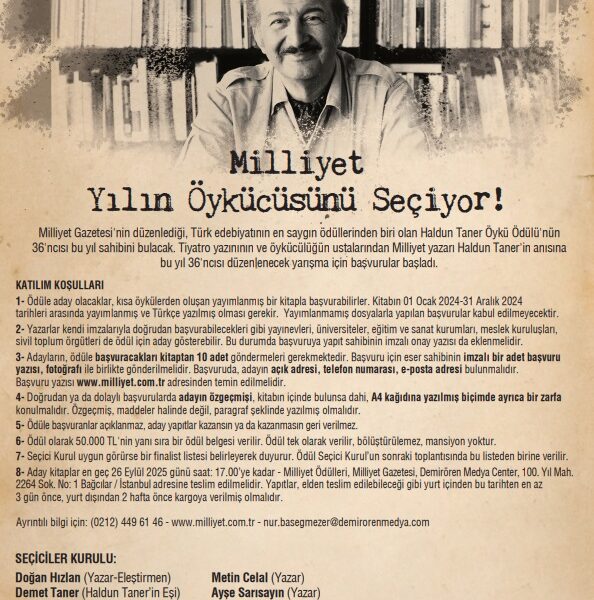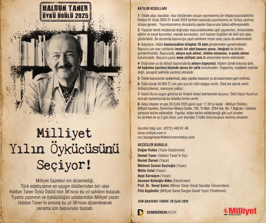 Milliyet Gazetesinin önderliğinde Haldun Tanerin anısına düzenlenen ‘Haldun Taner Öykü Ödülü’ yarışması, 36ncı kez kültür sanat dünyasına yeni isimler kazandırmaya devam ediyor. Aralıksız olarak düzenlenen yarışmanın Seçici Kurulu’nda Demet Taner, Doğan Hızlan, Nursel Duruel, Mehmet Zaman Saçlıoğlu, Metin Celal, Ayşe Sarısayın, Asuman Kafaoğlu-Büke, Prof. Dr. Seval Şahin ve Filiz Aygündüz yer alıyor. Edebiyatta isimlerini duyurmuş olanların yanı sıra edebiyat dünyasına yeni adım atmış yazarların da katılabildiği Haldun Taner Öykü Ödülü yarışması güncelle kalıcılığı buluşturmaya devam ediyor.
