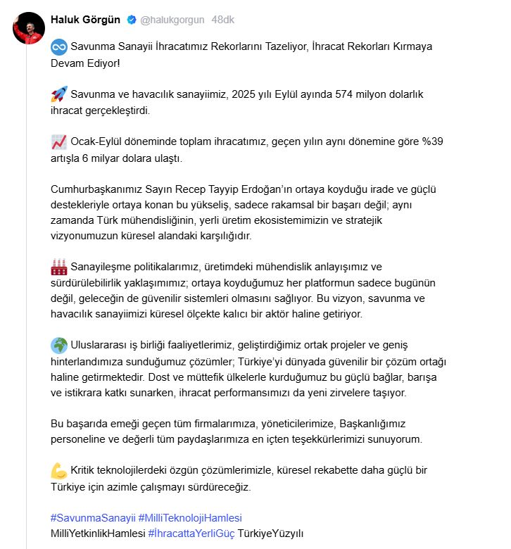 Savunma Sanayii Başkanı Görgün, eylül ayı dış ticaret istatistiklerine ilişkin NSosyal hesabından açıklama yaptı. Görgün, savunma sanayi ihracatının rekor tazelediğini ve ihracat rekorları kırmaya devam ettiğini belirterek, “Savunma ve havacılık sanayiimiz, 2025 yılı Eylül ayında 574 milyon dolarlık ihracat gerçekleştirdi. Ocak-eylül döneminde toplam ihracatımız, geçen yılın aynı dönemine göre yüzde 39 artışla 6 milyar dolara ulaştı. Cumhurbaşkanımız Sayın Recep Tayyip Erdoğan’ın ortaya koyduğu irade ve güçlü destekleriyle ortaya konan bu yükseliş, sadece rakamsal bir başarı değil; aynı zamanda Türk mühendisliğinin, yerli üretim ekosistemimizin ve stratejik vizyonumuzun küresel alandaki karşılığıdır” ifadelerini kullandı.