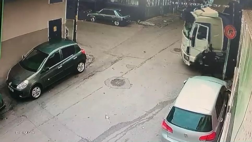• Bursa'da, sürücüsünün el frenini çekmeyi unuttuğu kamyon, bir anda ilerledi. Koşarak kamyona binen sürücü, el frenini çekip aracın park halindeki otomobile çarpmasını son anda engelledi. O anlar çevredeki iş yerinin güvenlik kamerasına yansıdı. Fotoğraf: