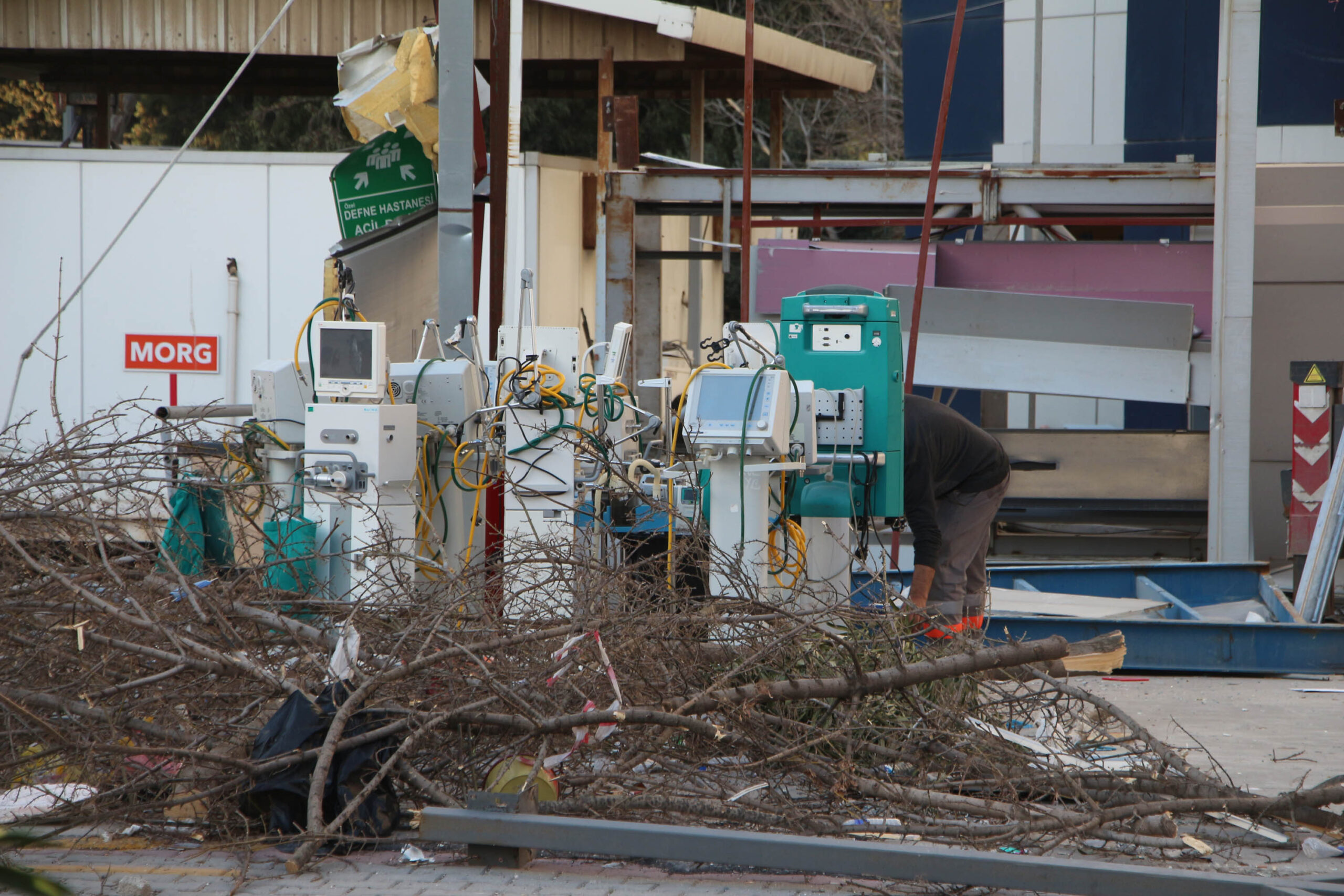 Bakan Koca’nın soruşturma başlatıldığını duyurduğu hastanenin çevresine çok sayıda iş makinesi ve vinç getirildi. Uzatılan merdivenle hastaneye giren ekipler, tıbbi cihazların deprem bölgesinde kullanılabilmesi amacıyla tahliyesini başlattı. Hastanedeki ekiplerin çalışması DHA tarafından görüntülendi. Görüntülerde; hastanenin depremlerde büyük hasar aldığı kaydedildi.