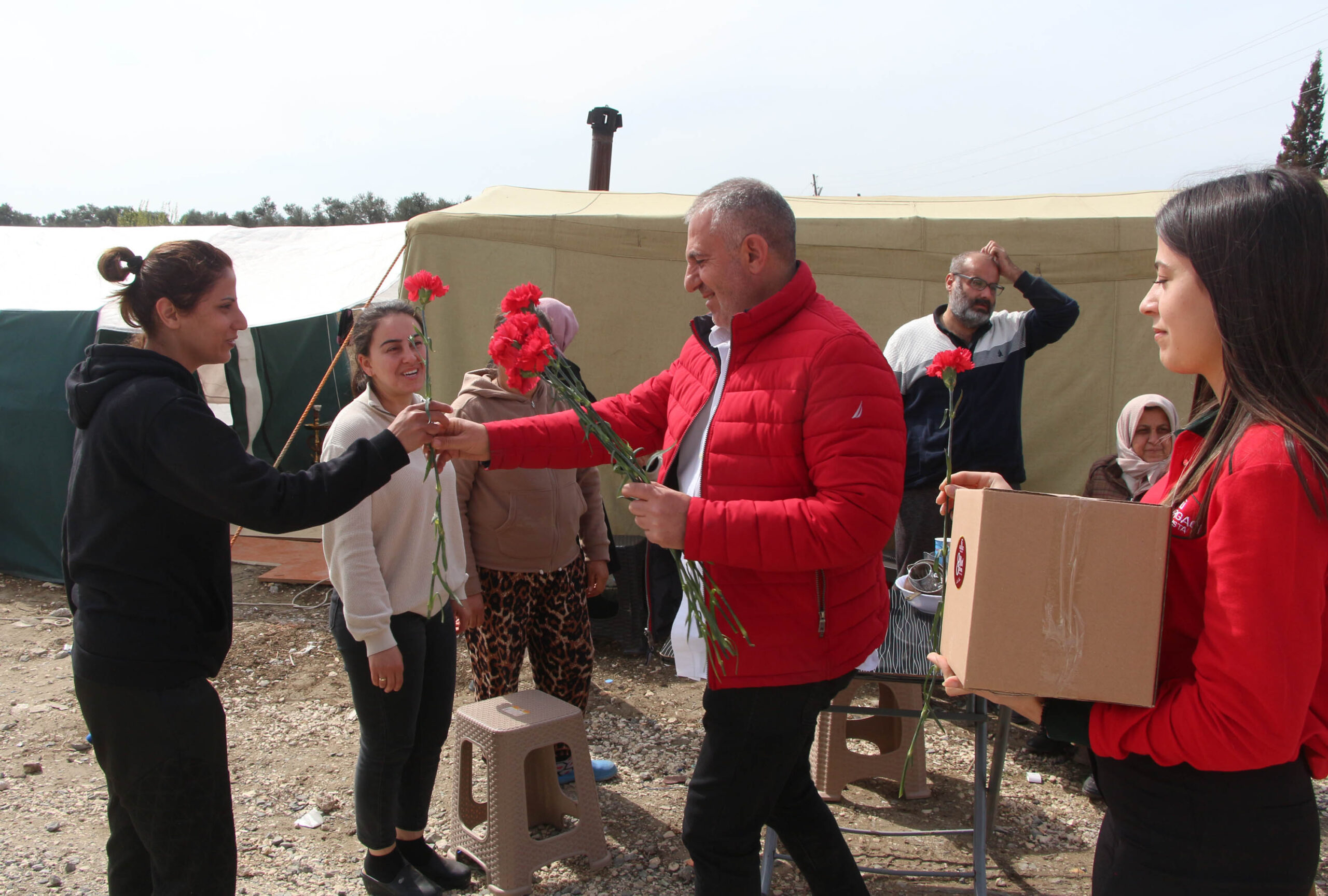 Hatay’da çadırda kalan kadınlara ‘8 Mart’ karanfili