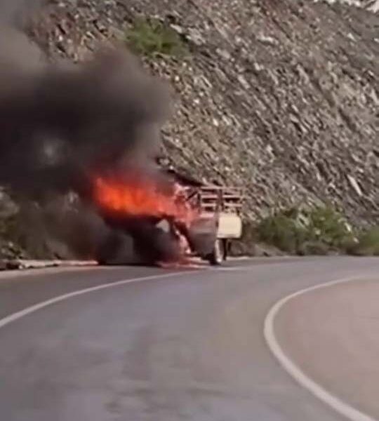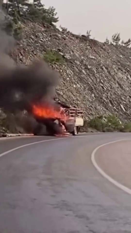 • Hatay'ın Yayladağı ilçesinde seyir halindeki bir kamyonet, motor kısmından alev alarak yandı. Fotoğraf: Hatay, (DHA)