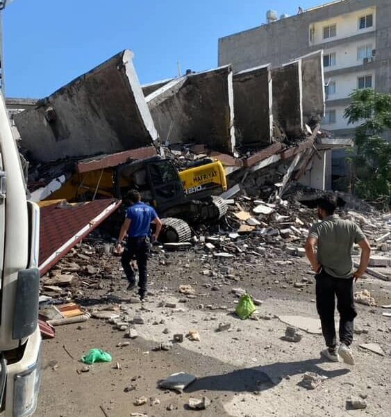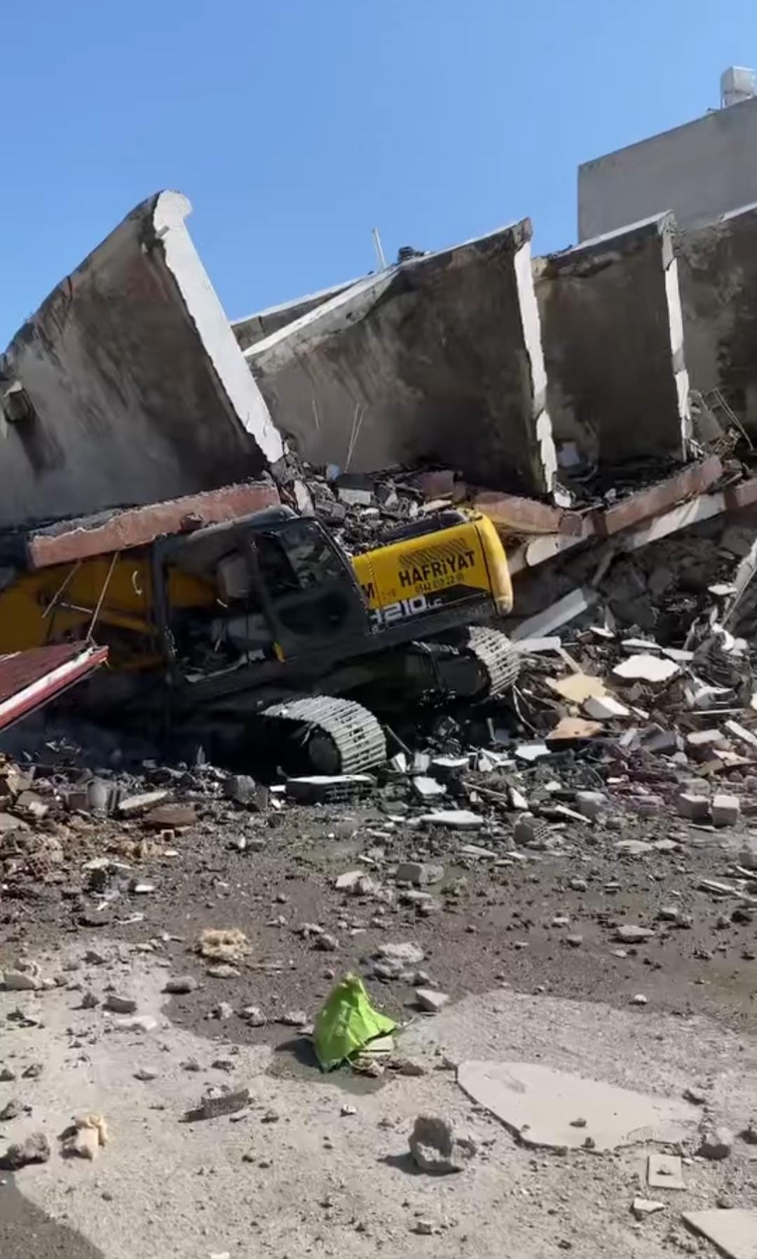 Hatay’da yıkım sırasında 7 katlı bina, iş makinesinin üzerine devrildi