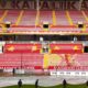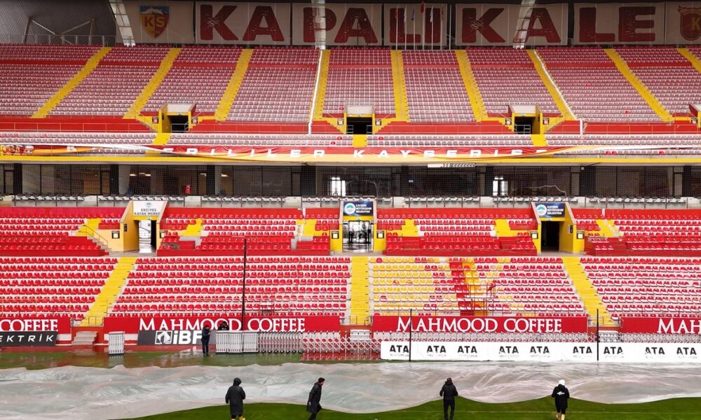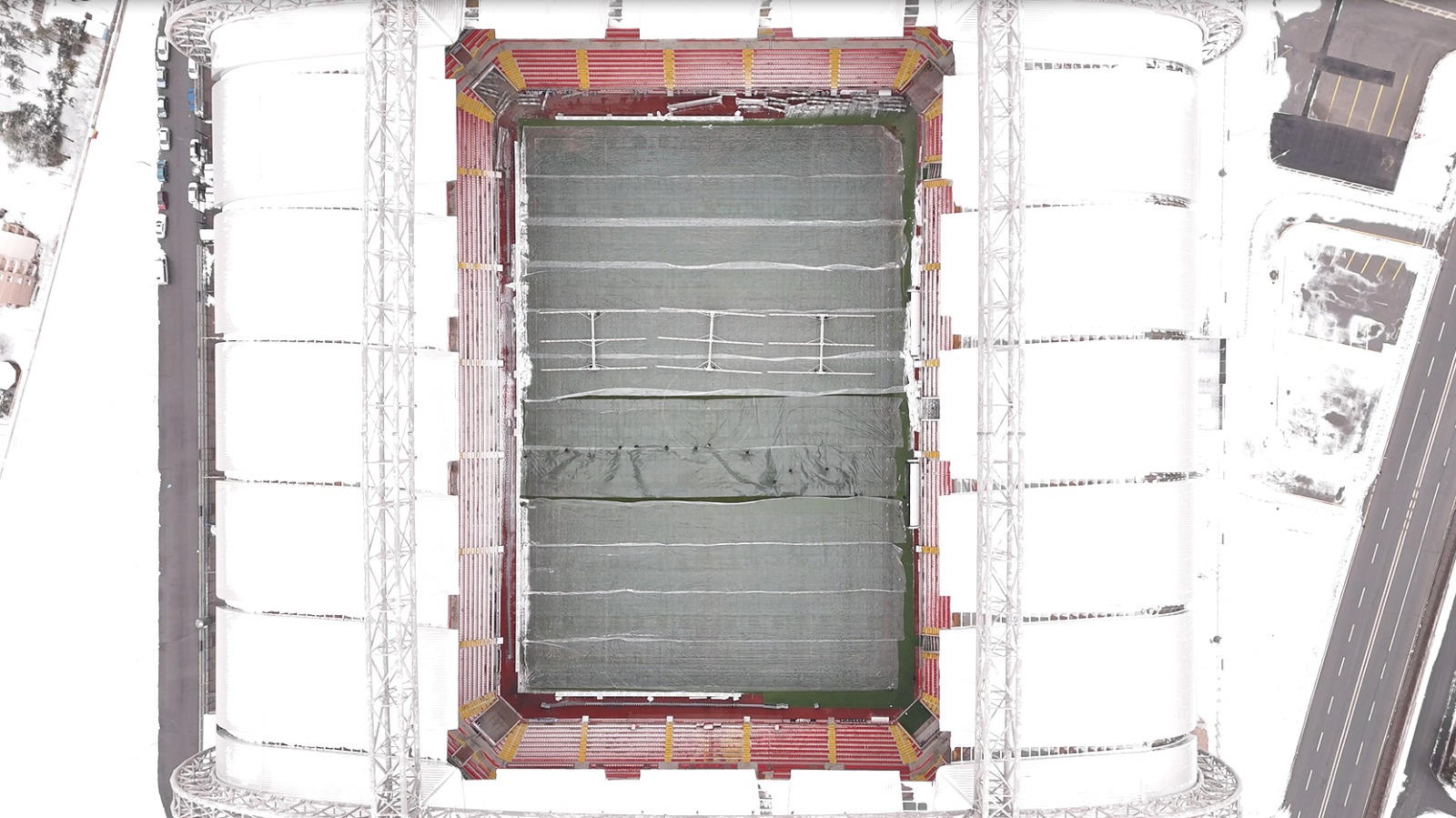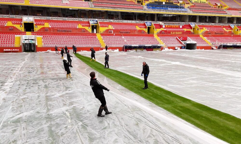 Kayserispor’un maçlarına ev sahipliği yapan RHG Enertürk Enerji Stadyumu’nun zemini, kentte hava sıcaklıklarının eksi 17 derecelere kadar düşmesinin ardından, özel naylon örtü ile kaplandı. Fotoğraf: Samed Aydın SUN/Kayseri, (DHA)