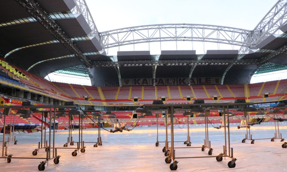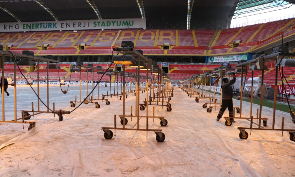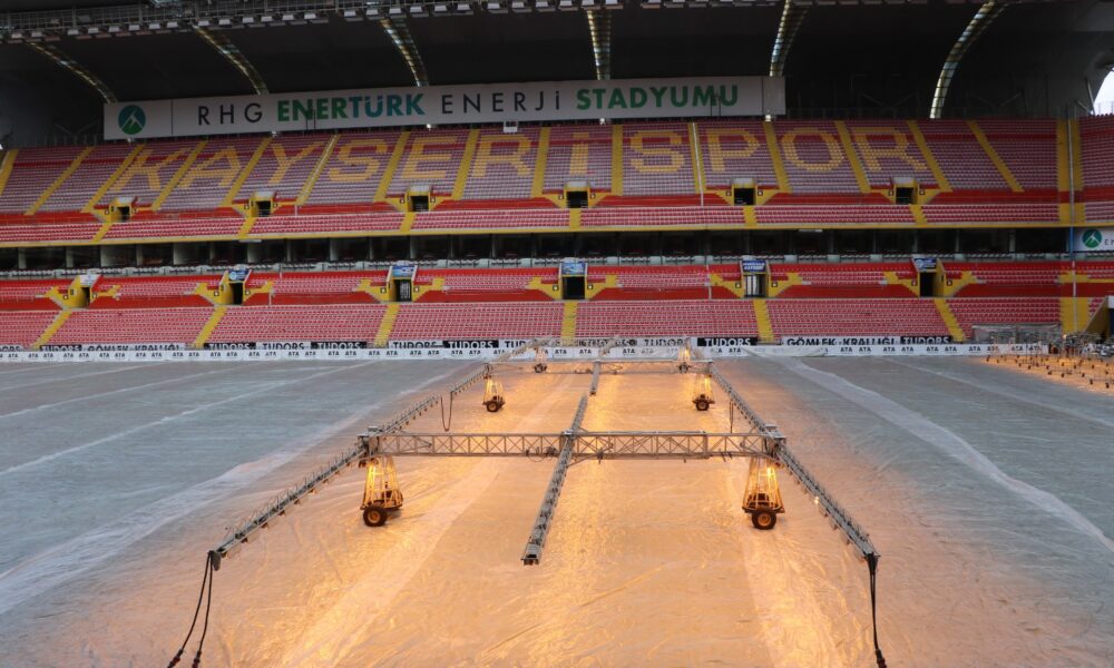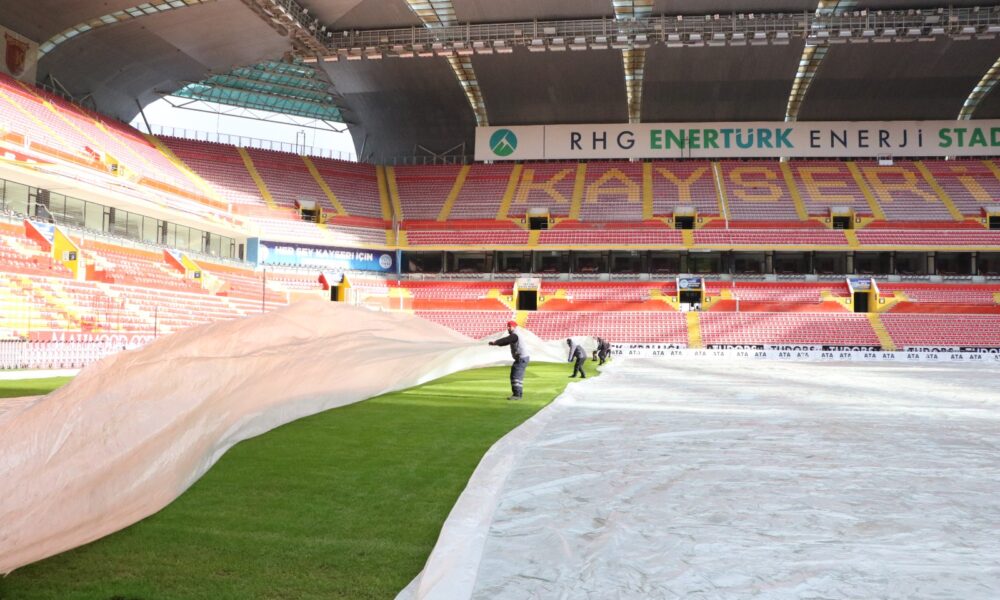 Kentte etkili olan kar yağışının ardından hava sıcaklıkları eksi 17 derecelere kadar düştü. Süper Lig’de mücadele eden Zecorner Kayserispor’un maçlarına ev sahipliği yapan RHG Enertürk Enerji Stadyumu’nda da zeminin korunması için çalışmalar yapıldı. Lige verilen arada, Büyükşehir Belediyesi bünyesindeki Spor A.Ş. tarafından bakım ve onarımları yapılan stadyumda, zeminin dondan etkilenmemesi için çim üstüne özel naylon örtü serildi. Eksi 17 derecede stadyum zemini naylon örtüyle hava aldırılmazken, 2-3 gün arasında ise örtü kaldırılıp çimler havalandırıldı. Yapay güneşleme sisteminin de devrede olduğu stadyumda, çimlerin soğuk havadan zarar görmemesi için çalışmalar sürüyor.