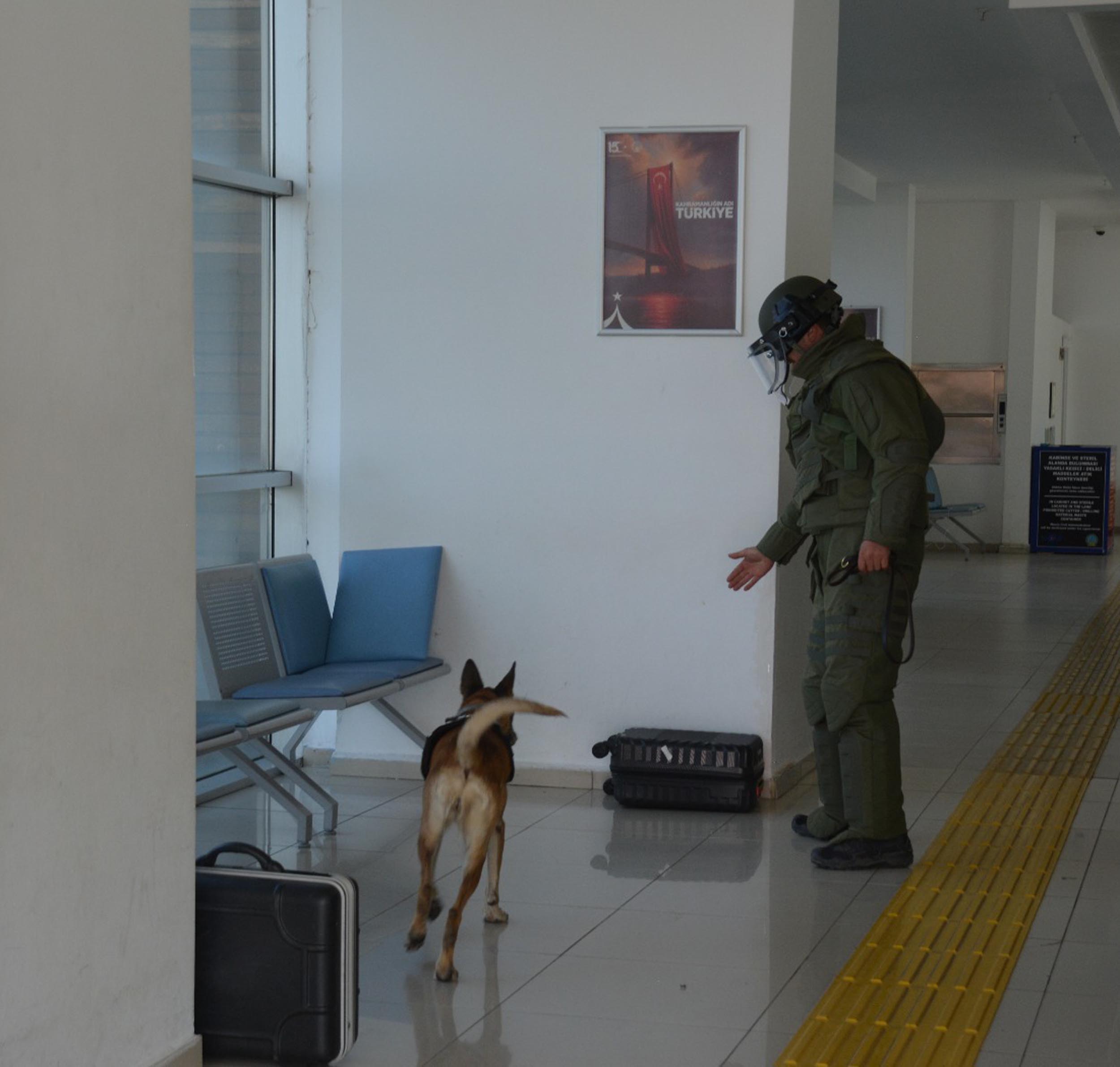 Iğdır Şehit Bülent Aydın Havalimanı'nda patlayıcı madde tatbikatı gerçeği aratmadı. Şüpheli paketin uzmanlar tarafından imha edildiği tatbikatta, özel harekât timleri, havalimanının yolcu salonunda arama yaptı. Fotoğraf: Özkan AYDIN / Iğdır,(DHA)