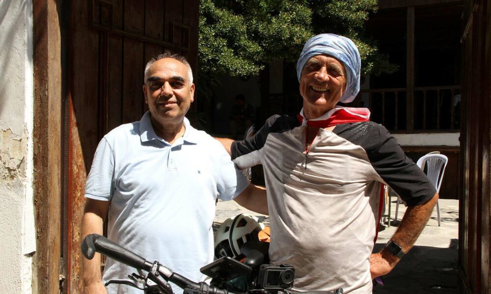 • Almanya'da yaşayan gurbetçi Mustafa Kemal Karcı (66) (sağda), çocukluğundan bu yana sevdalısı olduğu bisikleti ile memleketi olan Manisa'nın Kula ilçesine gelmek için 4 Mayıs'ta çıktığı yolculuğunu tamamladı. Fotoğraf: Hasan YİĞEN / Kula (Manisa), (DHA)