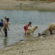 Hayvanlar gölette serinledi; besiciler ile çocukları onlarla ilgilendi