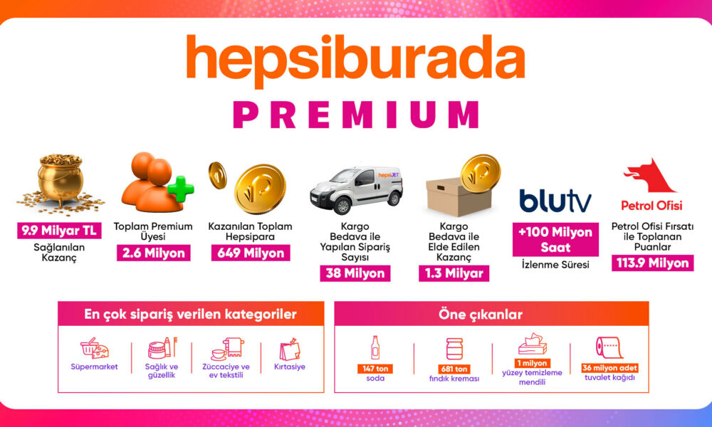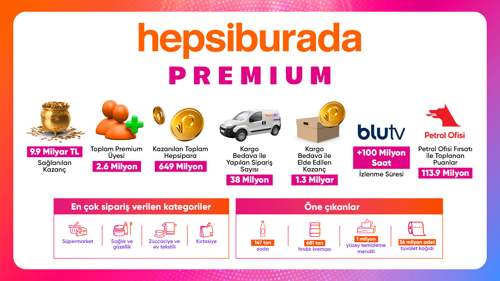 Hepsiburada Premium üyeleri, iki yıl içinde üyelere yapılan özel kampanya ve indirimlerle 6 milyar TL fayda elde ederken, alışverişleriyle toplamda 649 milyon TL Hepsipara kazandı. 38 milyon siparişte ücretsiz kargodan yararlanan Premium’lulara bu avantajla da 1,3 milyar TLlik bir tasarruf sağlandı.
