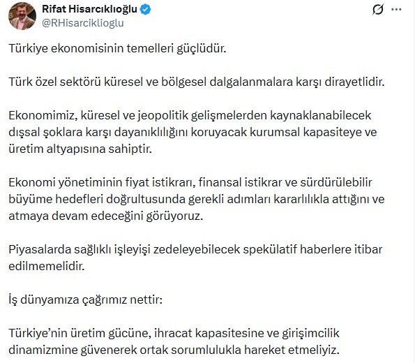 Hisarcıklıoğlu, sanal medya hesabından yaptığı açıklamada, “Türkiye ekonomisinin temelleri güçlüdür. Türk özel sektörü küresel ve bölgesel dalgalanmalara karşı dirayetlidir. Ekonomimiz, küresel ve jeopolitik gelişmelerden kaynaklanabilecek dışsal şoklara karşı dayanıklılığını koruyacak kurumsal kapasiteye ve üretim altyapısına sahiptir. Ekonomi yönetiminin fiyat istikrarı, finansal istikrar ve sürdürülebilir büyüme hedefleri doğrultusunda gerekli adımları kararlılıkla attığını ve atmaya devam edeceğini görüyoruz. Piyasalarda sağlıklı işleyişi zedeleyebilecek spekülatif haberlere itibar edilmemelidir. İş dünyamıza çağrımız nettir: Türkiye’nin üretim gücüne, ihracat kapasitesine ve girişimcilik dinamizmine güvenerek ortak sorumlulukla hareket etmeliyiz” ifadelerini kullandı.