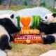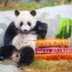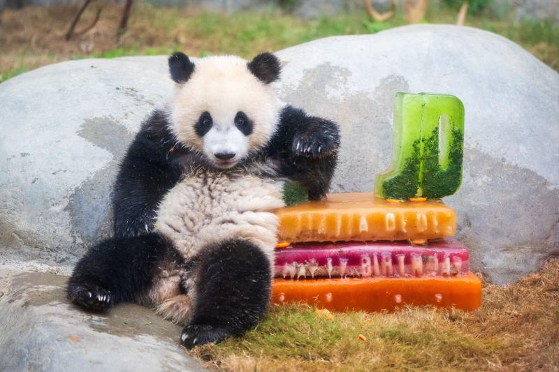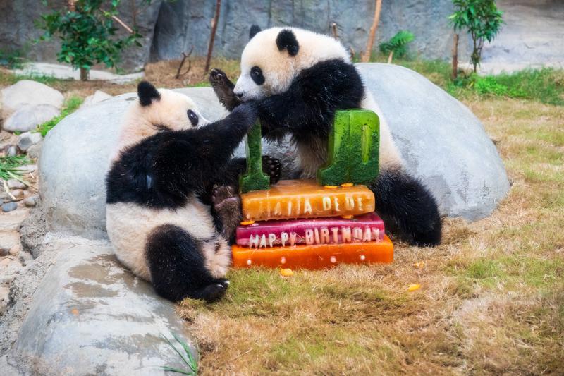 Bakıcılar, ikiz pandaların baş harfleri ve ‘1’rakamını taşıyan dondurulmuş bambu ve havuçlarla hazırlanmış buzlu bir doğum günü pastası hazırladı. Doğduklarında 122 ve 112 gram ağırlığında olan ikiz pandaların, şu an 30 kilo oldukları kaydedildi.