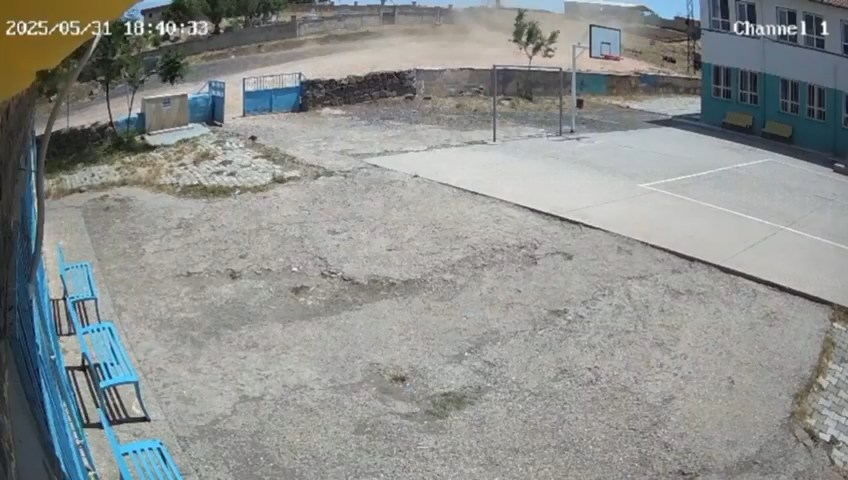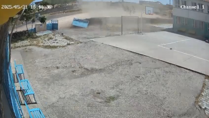Olay, dün Siverek’e yaklaşık 6 kilometre uzaklıkta bulunan Bayırözü İlkokulu ve Ortaokulu’nda meydana geldi. Hava sıcaklığının 33 dereceyi bulduğu ilçede aniden oluşan kum şeytanı hortumu, toz bulutuyla birlikte okulun bahçesinin demir kapısını yerinden söküp savurdu. Yaklaşık 5 saniye süren doğa olayı sonrasında kapının yerinde olmadığını fark eden okul yetkilileri, güvenlik kameralarını inceledi. Görüntülerde kapının hortum nedeniyle yerinden söktüğü tespit edildi.