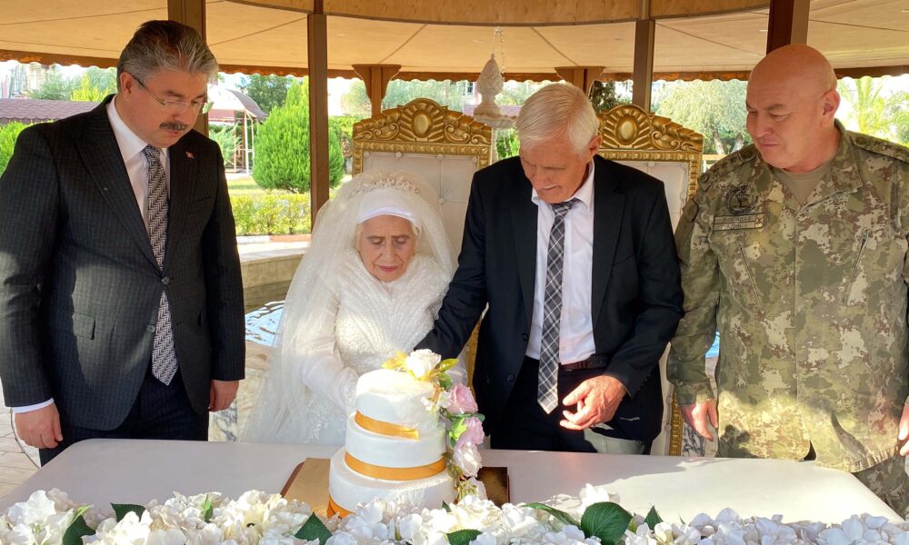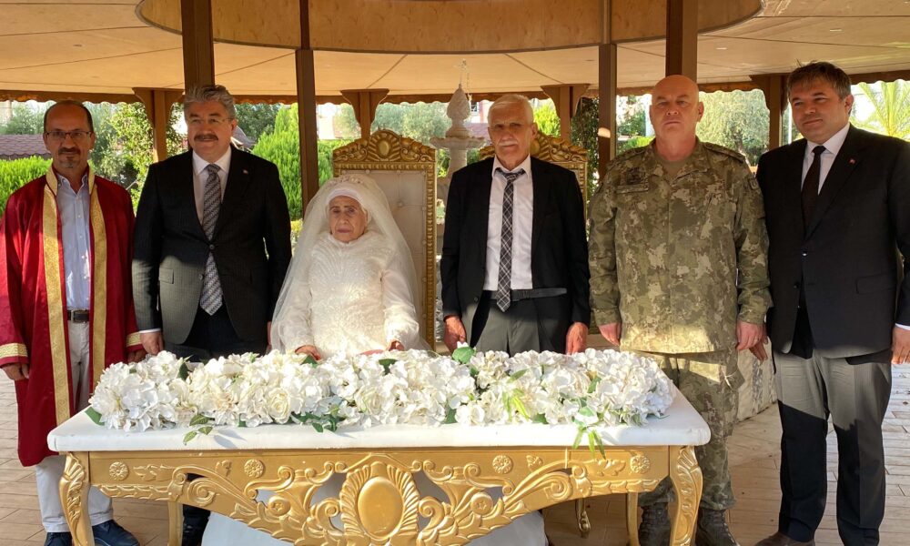 • Osmaniye'de huzurevinde evlenen Hatice Sağır ile Celil Kurt'un nikah şahitliğini ise Vali Erdinç Yılmaz, (Fotoğrafta gelinin yanında) Garnizon Komutan Vekili Hakan Kocabaş ve Aile ve Sosyal Politikalar İl Müdürü Tolga Nacar (Fotoğrafta en solda) yaptı. Fo