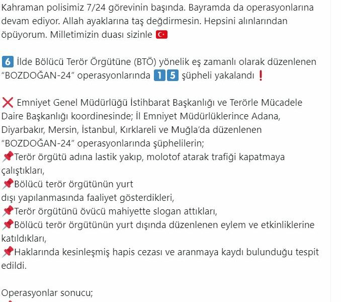 İÇİŞLERİ Bakanı Ali Yerlikaya, 6 ilde Bölücü Terör Örgütüne (BTÖ) yönelik eş zamanlı olarak düzenlenen Bozdoğan-24 operasyonlarında 15 şüphelinin yakalandığını duyurdu.İçişleri Bakanı Ali Yerlikaya sosyal medya hesabından yaptığı açıklamada “6 ilde Bölücü Terör Örgütüne (BTÖ) yönelik eş zamanlı olarak düzenlenen Bozdoğan-24 operasyonlarında 15 şüpheli yakalandı. Emniyet Genel Müdürlüğü İstihbarat Başkanlığı ve Terörle Mücadele Daire Başkanlığı koordinesinde, İl Emniyet Müdürlüklerince Adana, Diyarbakır, Mersin, İstanbul, Kırklareli ve Muğla’da düzenlenen operasyonlarda, şüphelilerin, terör örgütü adına lastik yakıp, molotof atarak trafiği kapatmaya çalıştıkları, bölücü terör örgütünün yurt dışı yapılanmasında faaliyet gösterdikleri, terör örgütünü övücü mahiyette slogan attıkları, bölücü terör örgütünün yurt dışında düzenlenen eylem ve etkinliklerine katıldıkları, haklarında kesinleşmiş hapis cezası ve aranmaya kaydı bulunduğu tespit edildi. Operasyonlar sonucunda çok sayıda dijital materyale el konuldu” dedi.Operasyona katılan personeli tebrik eden Bakan Yerlikaya, “Kahraman polisimiz 7/24 görevinin başında. Bayramda da operasyonlarına devam ediyor. Allah ayaklarına taş değdirmesin. Hepsini alınlarından öpüyorum. Milletimizin duası sizinle” ifadelerini kullandı.