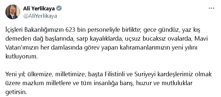 Bakan Yerlikaya, sosyal medya hesabı üzerinden paylaştığı yeni yıl mesajında, “İçişleri Bakanlığımızın 623 bin personeliyle birlikte; gece gündüz, yaz kış demeden dağ başlarında, sarp kayalıklarda, uçsuz bucaksız ovalarda, Mavi Vatanımızın her damlasında görev yapan kahramanlarımızın yeni yılını kutluyorum. Yeni yıl; ülkemize, milletimize, başta Filistinli ve Suriyeli kardeşlerimiz olmak üzere mazlum milletlere ve tüm insanlığa barış, huzur ve mutluluklar getirsin” ifadelerini kullandı.