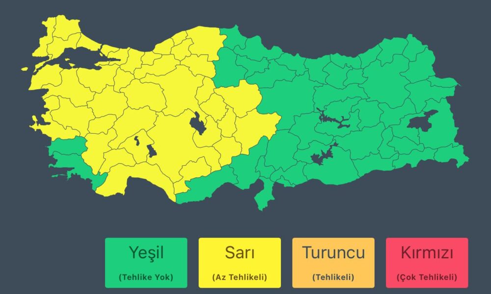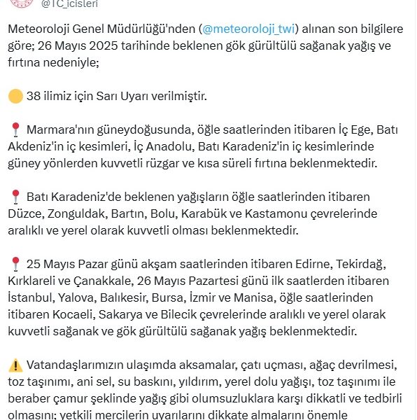Bakanlığın sosyal medya hesabından yapılan açıklamada, “Meteoroloji Genel Müdürlüğünden alınan son bilgilere göre; 26 Mayıs 2025 tarihinde beklenen gök gürültülü sağanak yağış ve fırtına nedeniyle; 38 ilimiz için sarı uyarı verilmiştir. Marmaranın güneydoğusunda, öğle saatlerinden itibaren İç Ege, Batı Akdenizin iç kesimleri, İç Anadolu, Batı Karadenizin iç kesimlerinde güney yönlerden kuvvetli rüzgar ve kısa süreli fırtına beklenmektedir. Batı Karadenizde beklenen yağışların öğle saatlerinden itibaren Düzce, Zonguldak, Bartın, Bolu, Karabük ve Kastamonu çevrelerinde aralıklı ve yerel olarak kuvvetli olması beklenmektedir. 25 Mayıs Pazar günü akşam saatlerinden itibaren Edirne, Tekirdağ, Kırklareli ve Çanakkale, 26 Mayıs Pazartesi günü ilk saatlerden itibaren İstanbul, Yalova, Balıkesir, Bursa, İzmir ve Manisa, öğle saatlerinden itibaren Kocaeli, Sakarya ve Bilecik çevrelerinde aralıklı ve yerel olarak kuvvetli sağanak ve gök gürültülü sağanak yağış beklenmektedir” denildi.