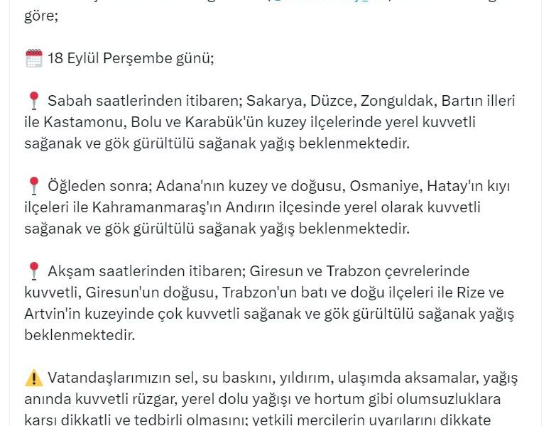 Bakanlığın sosyal medya hesabından yapılan açıklamada, “Meteoroloji Genel Müdürlüğünden alınan son bilgilere göre; 18 Eylül Perşembe günü; sabah saatlerinden itibaren; Sakarya, Düzce, Zonguldak, Bartın illeri ile Kastamonu, Bolu ve Karabükün kuzey ilçelerinde yerel kuvvetli sağanak ve gök gürültülü sağanak yağış beklenmektedir. Öğleden sonra; Adananın kuzey ve doğusu, Osmaniye, Hatayın kıyı ilçeleri ile Kahramanmaraşın Andırın ilçesinde yerel olarak kuvvetli sağanak ve gök gürültülü sağanak yağış beklenmektedir. Akşam saatlerinden itibaren; Giresun ve Trabzon çevrelerinde kuvvetli, Giresunun doğusu, Trabzonun batı ve doğu ilçeleri ile Rize ve Artvinin kuzeyinde çok kuvvetli sağanak ve gök gürültülü sağanak yağış beklenmektedir. Vatandaşlarımızın sel, su baskını, yıldırım, ulaşımda aksamalar, yağış anında kuvvetli rüzgar, yerel dolu yağışı ve hortum gibi olumsuzluklara karşı dikkatli ve tedbirli olmasını; yetkili mercilerin uyarılarını dikkate almalarını önemle hatırlatıyoruz” denildi.