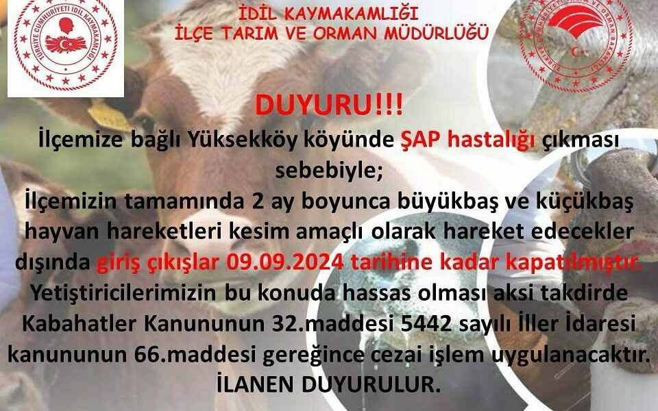 İdil ilçesine bağlı Yüksekköy köyünde şap hastalığı tespit edilmesi üzerine, ilçede 2 ay boyunca hayvan hareketleri durduruldu. İlçe Tarım ve Orman Müdürlüğünden yapılan açıklamada, 9 Eylül 2024 tarihine kadar kesim amaçlı dışında ilçeye büyükbaş ile küçükbaşların giriş ve çıkışlarının yasaklandığı belirtilerek, “İlçemize bağlı Yüksekköy köyünde şap hastalığı çıkması sebebiyle, ilçemizin tamamına 2 ay boyunca büyükbaş ve küçükbaş hayvan hareketleri, kesim amaçlı olarak hareket edecekler dışında 9 Eylül 2024 tarihine kadar kapatılmıştır. Yetiştiricilerimizin bu konuda hassas olması, aksi takdirde Kabahatler Kanunu’nun 32’nci maddesi 5442 sayılı İller İdaresi Kanunu’nun 66’ncı maddesi gereğince cezai işlem uygulanacaktır” denildi.