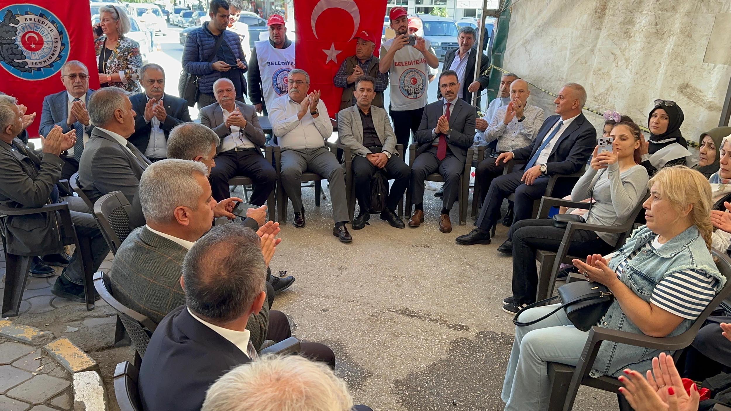 31 Mart Yerel Seçimlerinde göreve gelen DEM Partili Mehmet Nuri Güneş tarafından gönderilen SMS ile iş akitleri sona eren 204 işçi, 8 Temmuz’da başladıkları oturma eylemini sürdürüyor. Belediye binası önüne kurdukları çadırda eylem yapan işçilere Belediye-İş Sendikası’na bağlı 30 şube başkanı destek verdi. İşçileri eylem çadırında ziyaret eden şube başkanları yanlarında olduklarını bildirdi.