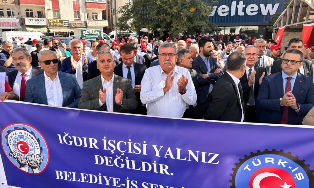 Belediye-İş Sendikası Genel Başkan Yardımcısı İsmail Duman, “Bugün, 85 gündür direnen Iğdır belediye emekçileri için dayanışmayı dosta, düşmana gösterme günüdür. Bugün, Iğdır Belediyesi emekçilerinin yalnız olmadığını, çaresiz olmadığını dosta düşmana gösterme günüdür. Bugün eşitlik, adalet, demokrasi, hak, hukuk, emek, emekçi sözcüklerini ağzından düşürmeyenlere karşı emekçinin gücünü ve birliğini gösterme günüdür. Bugün dayanışmanın, bugün emeğin günüdür. DEM’li Iğdır Belediye Başkanı Mehmet Nuri Güneş, yerel seçimlerin ardından, yasaya, toplu sözleşme hükümlerine rağmen, iş yeri sendika temsilcilerimizin iş yerini değiştirdi. Üyelerimizi mobbingle, baskıyla, istifaya zorladı, Emekçiler tüm baskılara rağmen işine, aşına sahip çıkıp istifa etmeyince, 204 emekçi kardeşimizi, işten atarak aileleriyle birlikte açlığa ve işsizliğe mahkum etti. Üstelik yerel seçimlerden önce ‘biz işçiden ve emekçiden yanayız, istiyorsanız kayıt yapın, biz geldiğimiz zaman işçileri çıkarmayacağız’ sözüne rağmen işten attı. Üstelik, seçimin ardından tanışma toplantısında ‘bizler kimsenin ekmeği ile oynamayacağız’ demesine rağmen, işten attı. Yapma, etme dedik, işçinin ekmeğiyle oynama dedik. Görüşme konuşma taleplerimizi elinin tersiyle itti. Bizi dinlemedi. Başkan Güneş’e soruyoruz, işten atılan arkadaşlarımız arasında kanser tedavisi gören arkadaşımız bile var. Kanser tedavisi gören arkadaşımız hangi parayla ilaçlarını alacak, tedavisine nasıl devam edecek? Hiç vicdanınız sızlamadı mı?” diye konuştu.