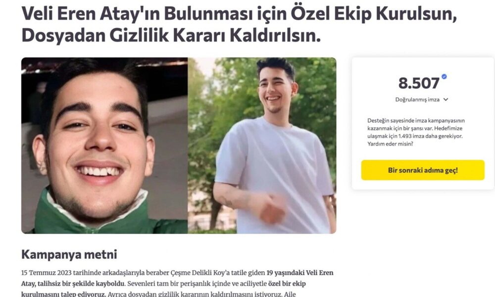 Karşıyaka ilçesinde yaşayan Mehmet Atay ile Ebru Atay çiftinin ilk çocuğu, Çınar Atayın (16) ağabeyi Veli Eren Atay, 15 Temmuz 2023te arkadaşlarıyla beraber bir konsere katılmak ve kamp yapmak için Çeşmeye gitti. Üç aydır bir diş protez laboratuvarında çalışan ve ailesinin izniyle o gün evinden çıkan Veli Eren Ataydan 16 Temmuz 2023ten bu yana haber alınamıyor.