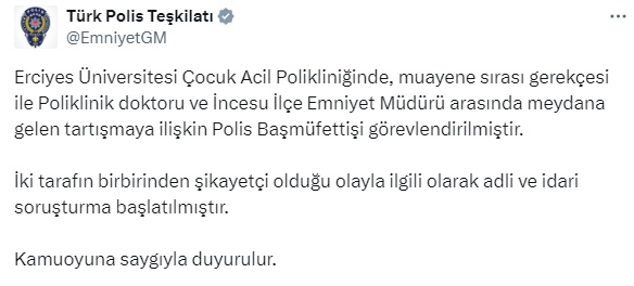 Olay, önceki gün Erciyes Üniversitesi Tıp Fakültesi Hastanesinde meydana geldi. İddiaya göre, İncesu İlçe Emniyet Müdürü Remzi Yıldırım ve yanında bulunan iki oğlu, acil polikliniğinde hasta muayene eden Çocuk Sağlığı ve Hastalıkları Doktoru Erhan Çetinin odasına girdi. Burada muayene sırası yüzünden tartışma çıktı. Tartışmanın büyümesi üzerine dışarıda bulunanlar tarafları ayırdı. Yaşanan olay sonrası doktor Çetin, Yıldırım ve yanındaki bir oğlundan şikayetçi oldu. Olayla ilgili soruşturma başlatıldı. Emniyet Genel Müdürlüğünün X hesabından yapılan yazılı açıklamada, “Erciyes Üniversitesi Çocuk Acil Polikliniğinde, muayene sırası gerekçesi ile poliklinik doktoru ve İncesu İlçe Emniyet Müdürü arasında meydana gelen tartışmaya ilişkin Polis Başmüfettişi görevlendirilmiştir. İki tarafın birbirinden şikayetçi olduğu olayla ilgili olarak adli ve idari soruşturma başlatılmıştır. Kamuoyuna saygıyla duyurulur” ifadelerine yer verildi.
