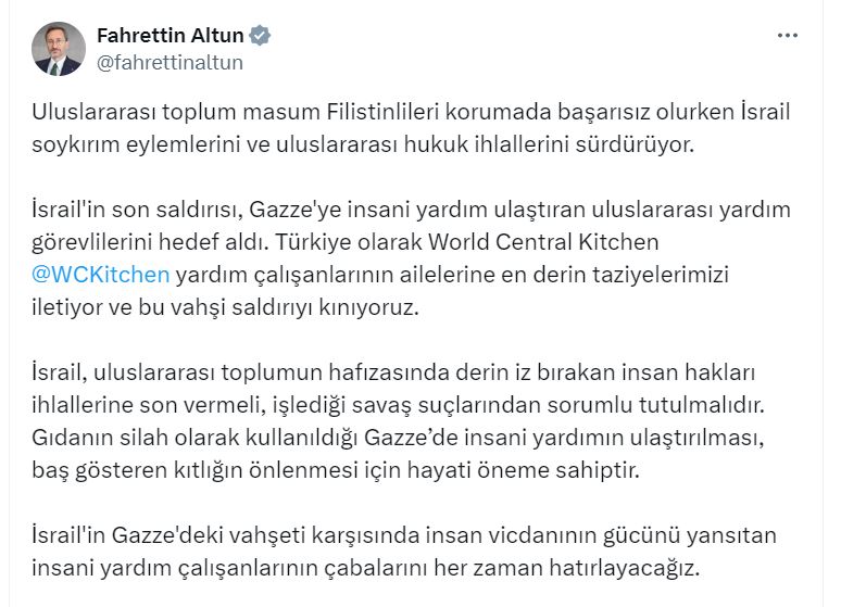 İLETİŞİM Başkanı Fahrettin Altun, “İsrail, uluslararası toplumun hafızasında derin iz bırakan insan hakları ihlallerine son vermeli, işlediği savaş suçlarından sorumlu tutulmalıdır. Gıdanın silah olarak kullanıldığı Gazzede insani yardımın ulaştırılması, baş gösteren kıtlığın önlenmesi için hayati öneme sahiptir” dedi.İletişim Başkanı Altun, sosyal medya hesabından yaptığı açıklamada, “Uluslararası toplum masum Filistinlileri korumada başarısız olurken İsrail soykırım eylemlerini ve uluslararası hukuk ihlallerini sürdürüyor. İsrailin son saldırısı, Gazzeye insani yardım ulaştıran uluslararası yardım görevlilerini hedef aldı. Türkiye olarak World Central Kitchen yardım çalışanlarının ailelerine en derin taziyelerimizi iletiyor ve bu vahşi saldırıyı kınıyoruz. İsrail, uluslararası toplumun hafızasında derin iz bırakan insan hakları ihlallerine son vermeli, işlediği savaş suçlarından sorumlu tutulmalıdır. Gıdanın silah olarak kullanıldığı Gazzede insani yardımın ulaştırılması, baş gösteren kıtlığın önlenmesi için hayati öneme sahiptir. İsrailin Gazzedeki vahşeti karşısında insan vicdanının gücünü yansıtan insani yardım çalışanlarının çabalarını her zaman hatırlayacağız” dedi.