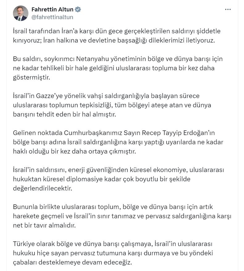 Altun, sosyal medya hesabından yaptığı açıklamada, “İsrail tarafından İrana karşı dün gece gerçekleştirilen saldırıyı şiddetle kınıyoruz; İran halkına ve devletine başsağlığı dileklerimizi iletiyoruz. Bu saldırı, soykırımcı Netanyahu yönetiminin bölge ve dünya barışı için ne kadar tehlikeli bir hale geldiğini uluslararası topluma bir kez daha göstermiştir. İsrailin Gazzeye yönelik vahşi saldırganlığıyla başlayan sürece uluslararası toplumun tepkisizliği, tüm bölgeyi ateşe atan ve dünya barışını tehdit eden bir hal almıştır” dedi.