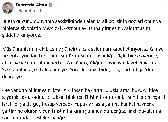 Altun, sosyal medya hesabından yaptığı paylaşımda, “Bütün gücünü dünyanın sessizliğinden alan İsrail polisinin gözleri önünde binlerce siyonistin Mescid-i Aksanın avlusuna girmesini, saldırmasını şiddetle kınıyoruz. Müslümanların ilk kıblesine yönelik alçak saldırıları kabul etmiyoruz. Kan ve provokasyondan beslenen İsrail’e karşı tüm insanlığı güçlü bir ses vermeye, ahlak ve vicdan sahibi herkesi Aksa’nın çığlığını duymaya davet ediyoruz. Sessiz kalamayız, kalmamalıyız. Yüreklerimizi birleştirip, barbarlığa dur demeliyiz. Öte yandan bilinmesini isteriz ki insan haklarını, uluslararası hukuku hiçe sayarak yaşlı, kadın, çocuk on binlerce Filistinli kardeşimizi şehit eden işgalci İsrail, er ya da geç hesap verecek. Yaptıkları asla yanına kar kalmayacak. Şartlar ne olursa olsun Filistin halkının yanında duracağız, haklı davalarına sonuna kadar destek olacağız” ifadelerine yer verdi.