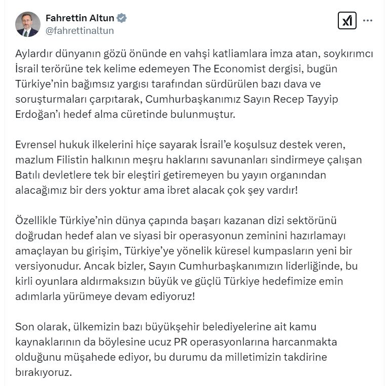 İletişim Başkanı Altun, sosyal medya hesabından yaptığı açıklamada, “Aylardır dünyanın gözü önünde en vahşi katliamlara imza atan, soykırımcı İsrail terörüne tek kelime edemeyen The Economist dergisi, bugün Türkiyenin bağımsız yargısı tarafından sürdürülen bazı dava ve soruşturmaları çarpıtarak, Cumhurbaşkanımız Sayın Recep Tayyip Erdoğanı hedef alma cüretinde bulunmuştur. Evrensel hukuk ilkelerini hiçe sayarak İsraile koşulsuz destek veren, mazlum Filistin halkının meşru haklarını savunanları sindirmeye çalışan Batılı devletlere tek bir eleştiri getiremeyen bu yayın organından alacağımız bir ders yoktur ama ibret alacak çok şey vardır” dedi.