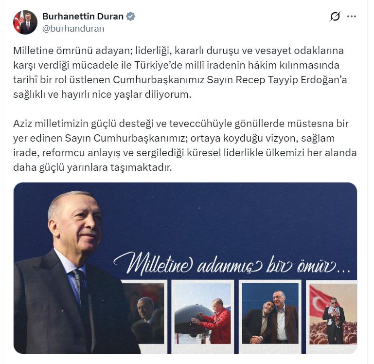 İletişim Başkanı Duran, sanal medya hesabından yaptığı paylaşımda, “Milletine ömrünü adayan; liderliği, kararlı duruşu ve vesayet odaklarına karşı verdiği mücadele ile Türkiyede milli iradenin hakim kılınmasında tarihi bir rol üstlenen Cumhurbaşkanımız Sayın Recep Tayyip Erdoğana sağlıklı ve hayırlı nice yaşlar diliyorum. Aziz milletimizin güçlü desteği ve teveccühüyle gönüllerde müstesna bir yer edinen Sayın Cumhurbaşkanımız; ortaya koyduğu vizyon, sağlam irade, reformcu anlayış ve sergilediği küresel liderlikle ülkemizi her alanda daha güçlü yarınlara taşımaktadır” dedi.