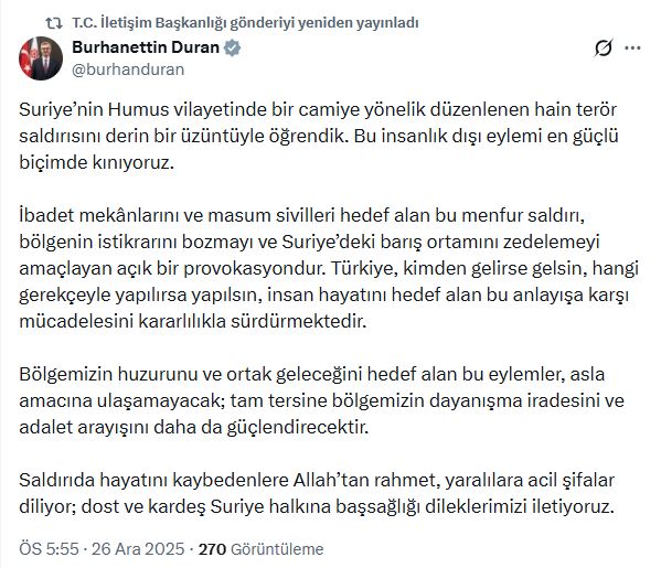 İletişim Başkanı Burhanettin Duran, sanal medya hesabından yaptığı açıklamada, “Suriyenin Humus vilayetinde bir camiye yönelik düzenlenen hain terör saldırısını derin bir üzüntüyle öğrendik. Bu insanlık dışı eylemi en güçlü biçimde kınıyoruz. İbadet mekanlarını ve masum sivilleri hedef alan bu menfur saldırı, bölgenin istikrarını bozmayı ve Suriye’deki barış ortamını zedelemeyi amaçlayan açık bir provokasyondur. Türkiye, kimden gelirse gelsin, hangi gerekçeyle yapılırsa yapılsın, insan hayatını hedef alan bu anlayışa karşı mücadelesini kararlılıkla sürdürmektedir. Bölgemizin huzurunu ve ortak geleceğini hedef alan bu eylemler, asla amacına ulaşamayacak; tam tersine bölgemizin dayanışma iradesini ve adalet arayışını daha da güçlendirecektir. Saldırıda hayatını kaybedenlere Allah’tan rahmet, yaralılara acil şifalar diliyor; dost ve kardeş Suriye halkına başsağlığı dileklerimizi iletiyoruz” dedi.