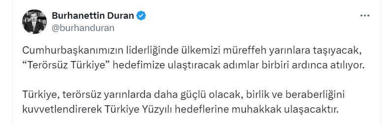 İletişim Başkanı Duran, sosyal medya hesabından yaptığı açıklamada, “Cumhurbaşkanımızın liderliğinde ülkemizi müreffeh yarınlara taşıyacak, Terörsüz Türkiye hedefimize ulaştıracak adımlar birbiri ardınca atılıyor. Türkiye, terörsüz yarınlarda daha güçlü olacak, birlik ve beraberliğini kuvvetlendirerek Türkiye Yüzyılı hedeflerine muhakkak ulaşacaktır” ifadelerini kullandı.