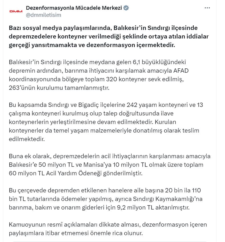 DMMnin sosyal medya hesabından yapılan açıklamada, “Bazı sosyal medya paylaşımlarında, Balıkesirin Sındırgı ilçesinde depremzedelere konteyner verilmediği şeklinde ortaya atılan iddialar gerçeği yansıtmamakta ve dezenformasyon içermektedir. Balıkesirin Sındırgı ilçesinde meydana gelen 6,1 büyüklüğündeki depremin ardından, barınma ihtiyacını karşılamak amacıyla AFAD koordinasyonunda bölgeye toplam 320 konteyner sevk edilmiş, 263ünün kurulumu tamamlanmıştır. Bu kapsamda Sındırgı ve Bigadiç ilçelerine 242 yaşam konteyneri ve 13 çalışma konteyneri kurulmuş olup talep doğrultusunda ilave konteynerlerin yerleştirilmesine devam edilmektedir” denildi.